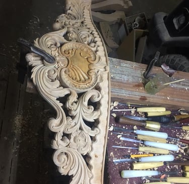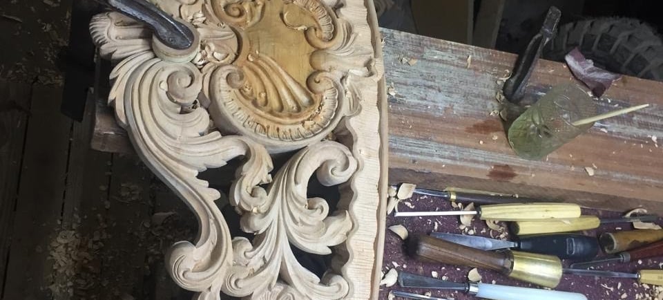 C’est ici que le meuble prend vie. A l’aide de ciseaux à bois, de gouges, de petits marteaux, Said sculpte les motifs : fleurs, coquilles, feuillages, arabesques, rosaces... Chaque sculpture est faite à la main, avec patience et précision. C’est une étape longue mais essentielle, qui donne à chaque meuble son unicité.